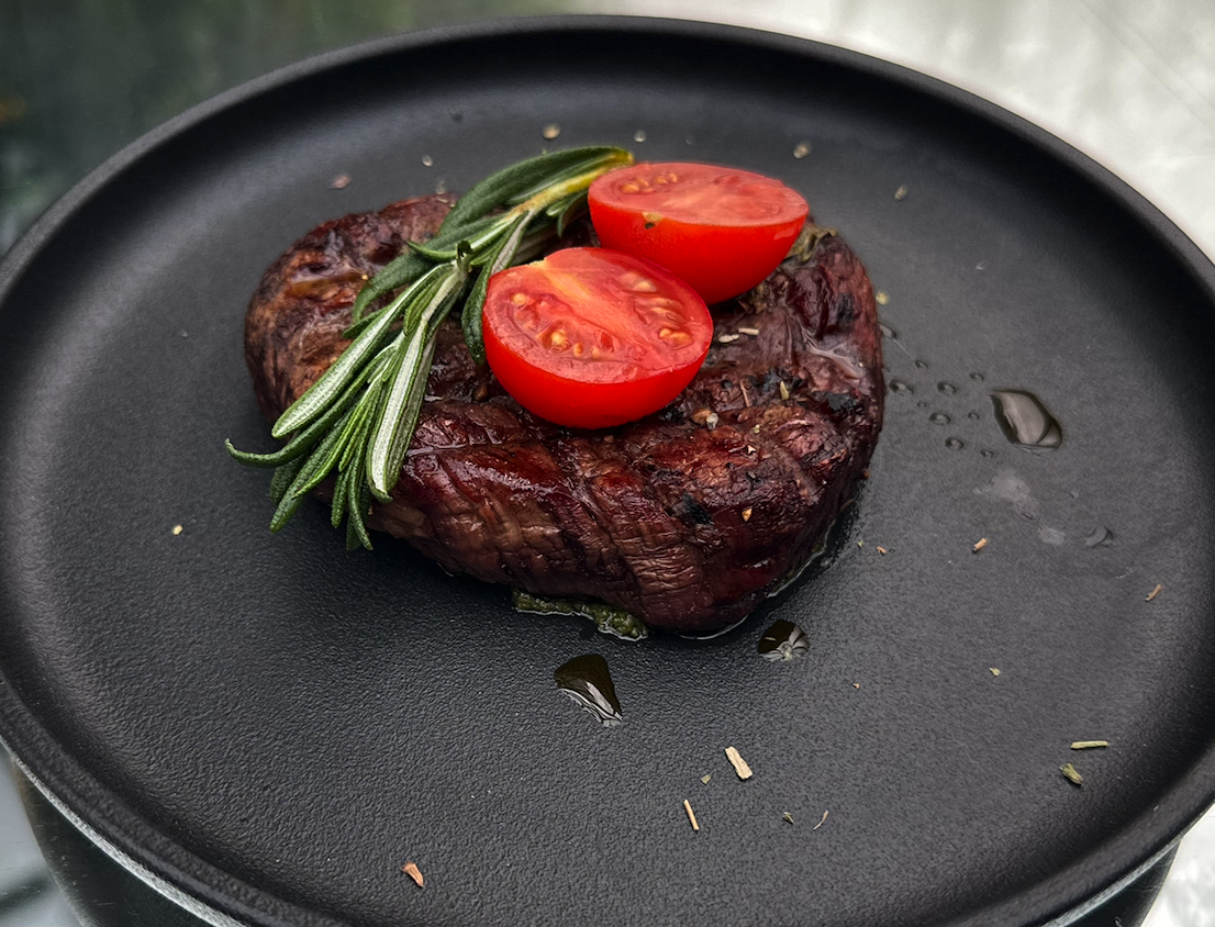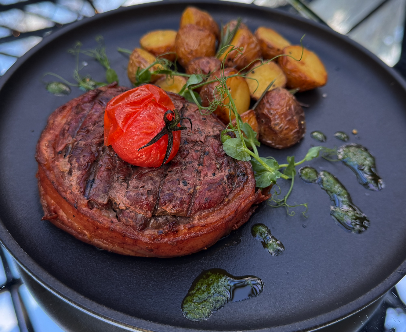 Стейк из говядины филе-миньон в беконе, обжаренный с розмарином на гриле