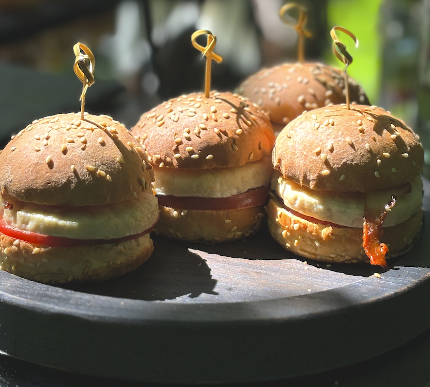 Мини-бургер с куриной котлетой, беконом, свежими овощами, луком фри и сырным соусом
