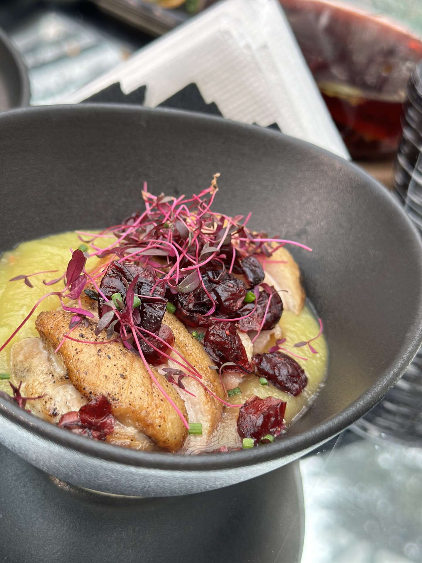 Нежные кусочки утки с грушевым пюре и сушеной клюквой