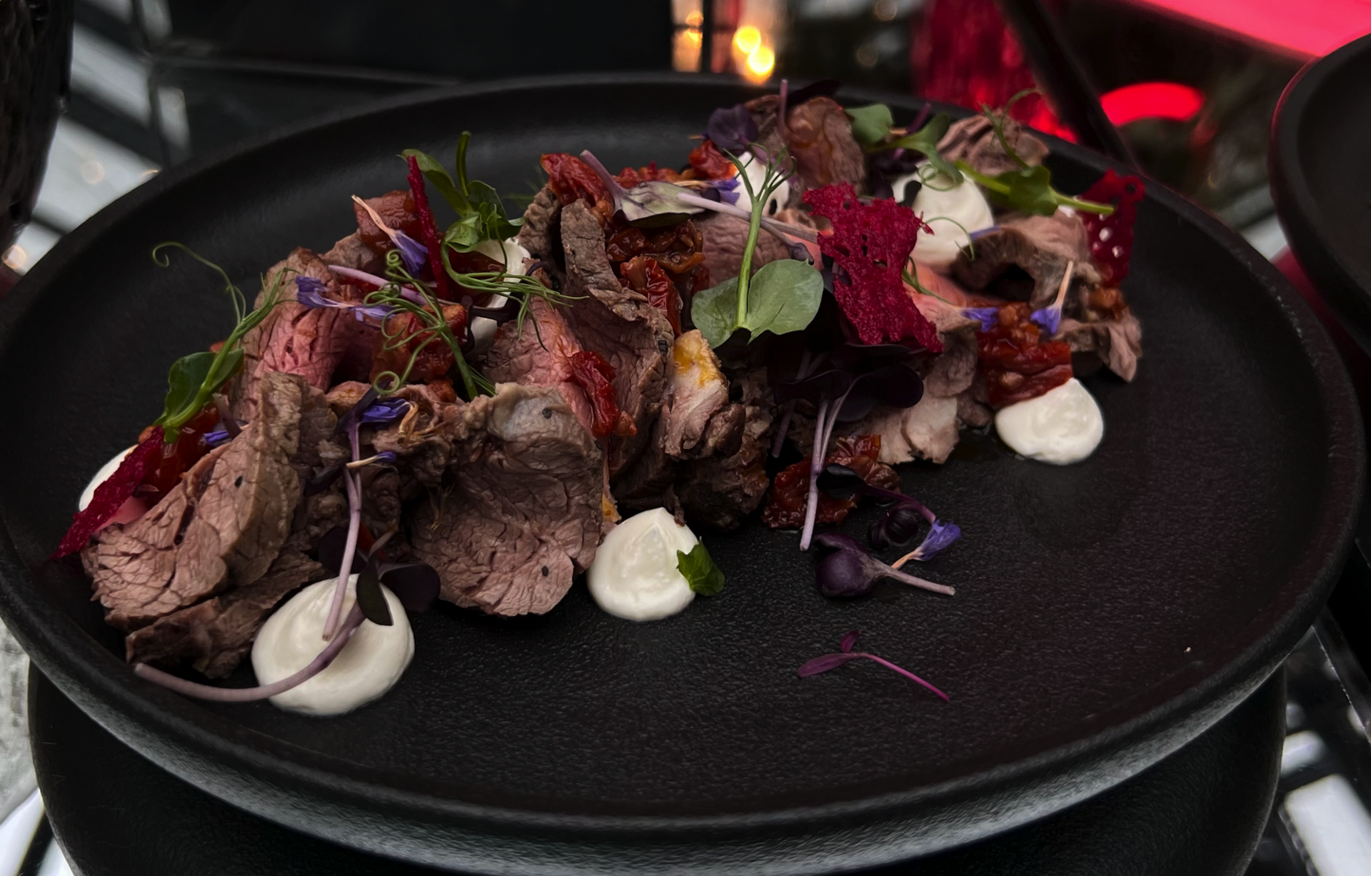 Стейк из нежной говядины, обжаренный на гриле с ароматными травами