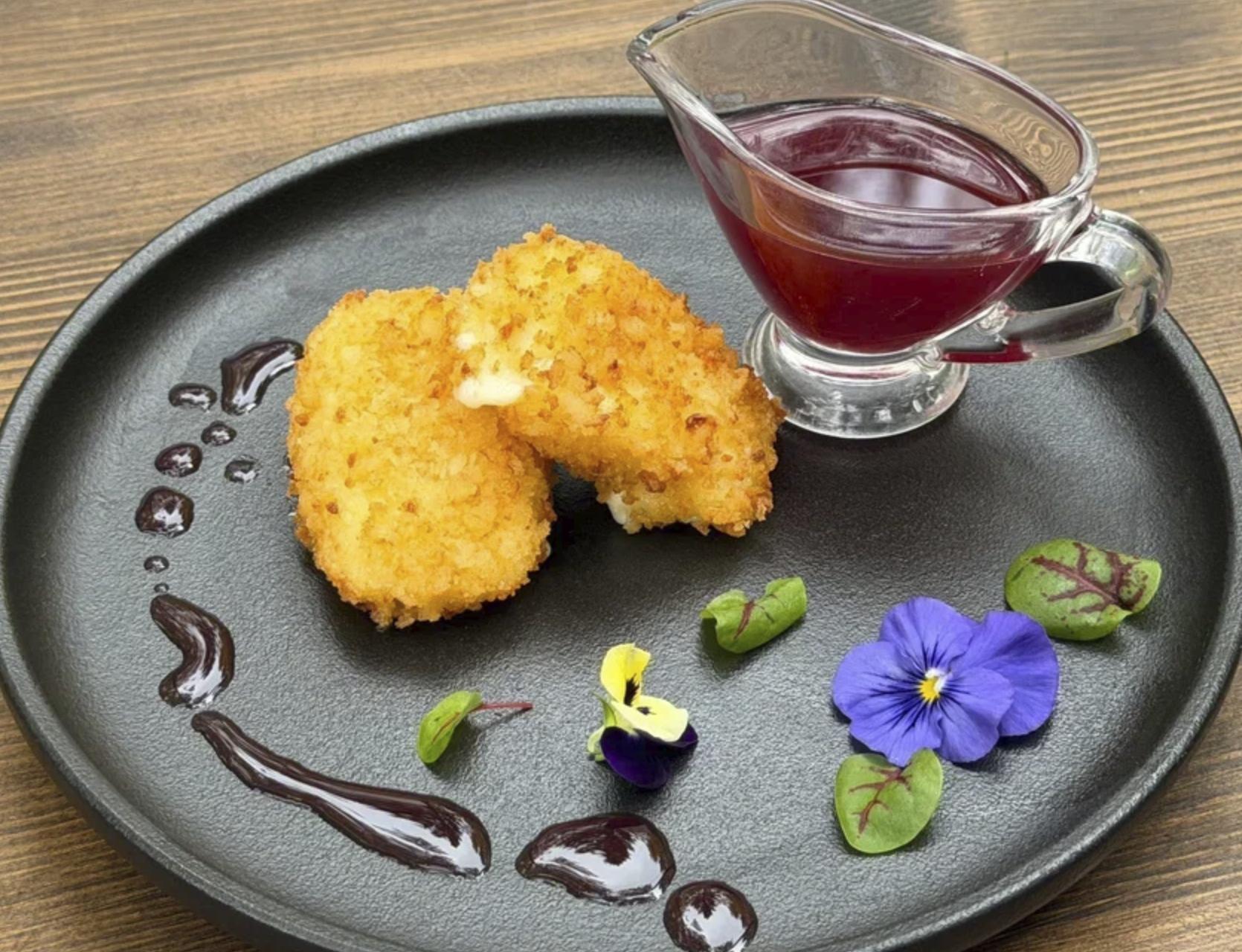 Нежнейший жареный сыр сулугуни. Подается клюквенным соусом