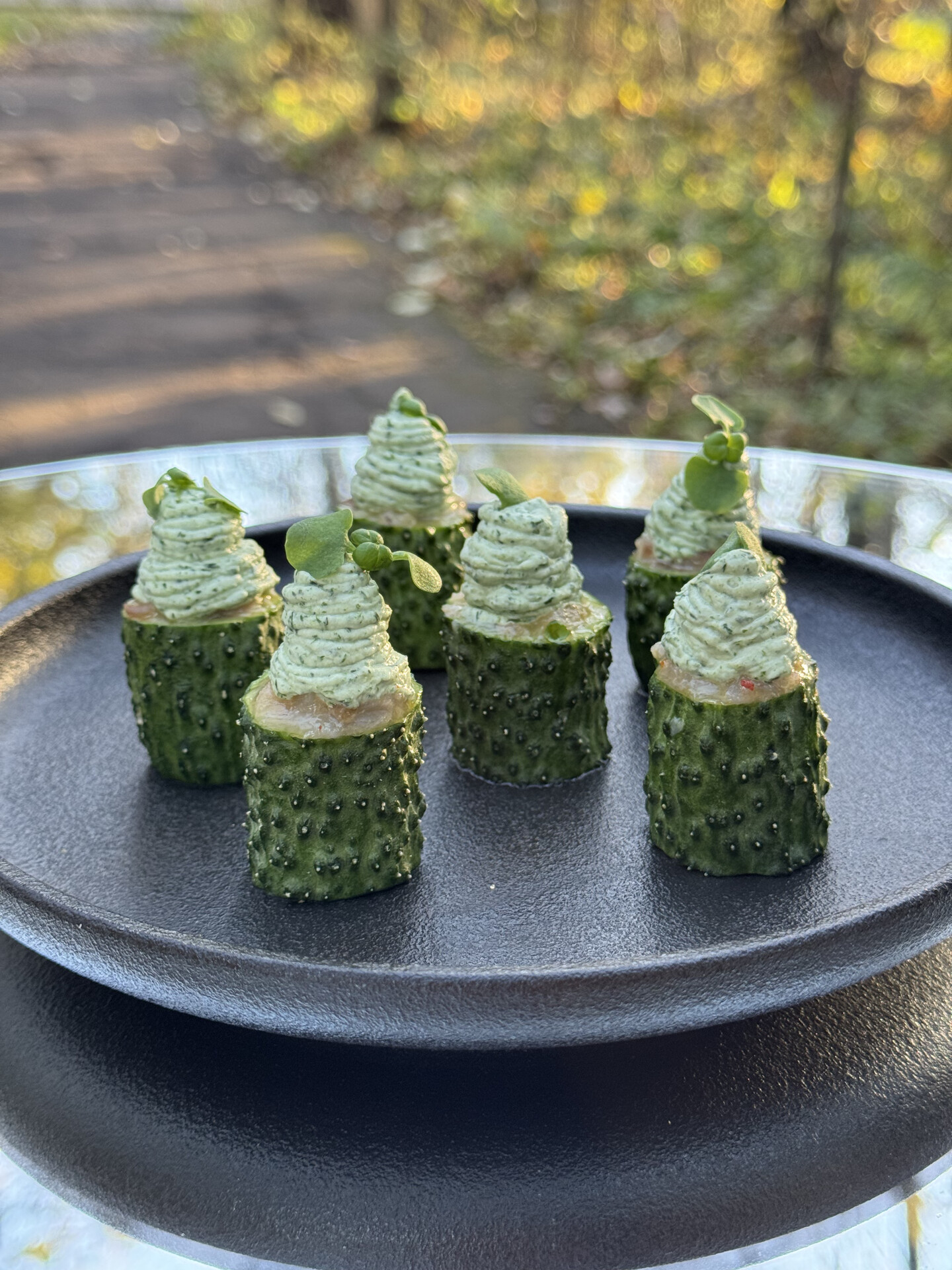 Фаршированный огурчик тар-таром из скумбрии и нежным сливочным муссом