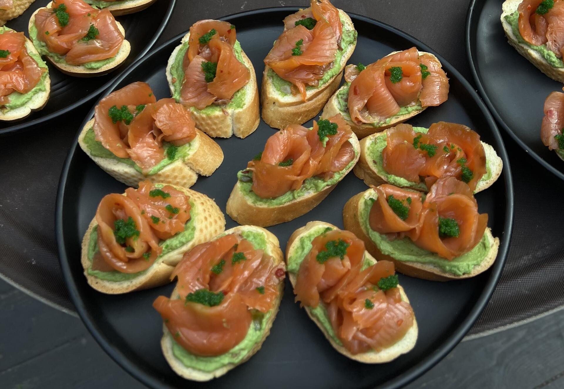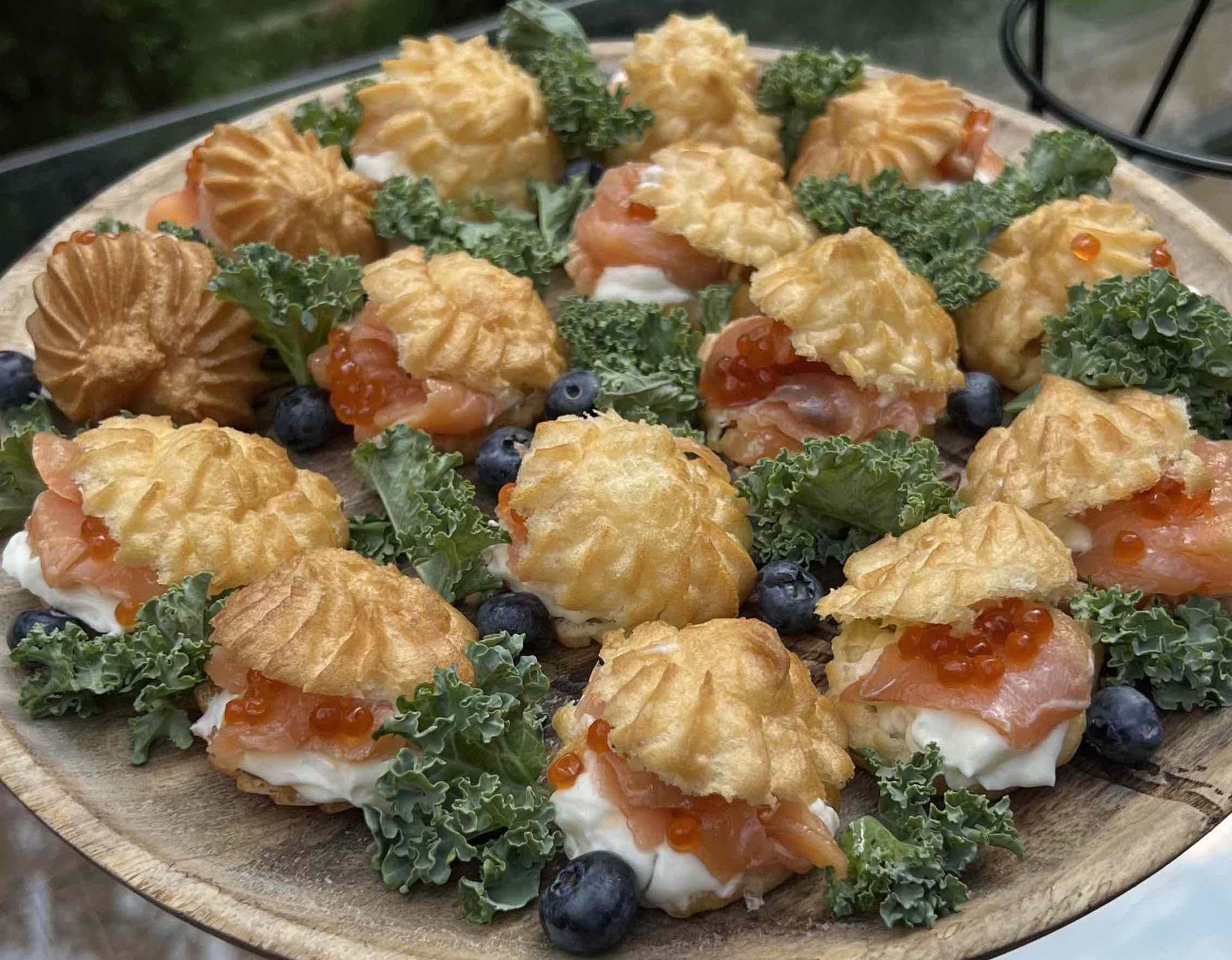 Профитроли со сливочным кремом, нежным лососем и красной икрой