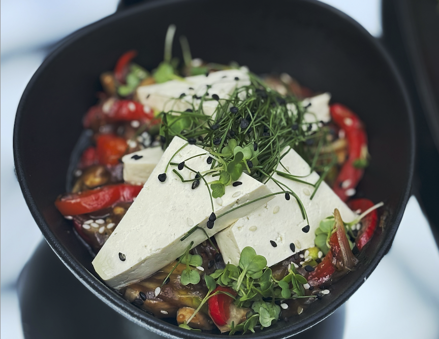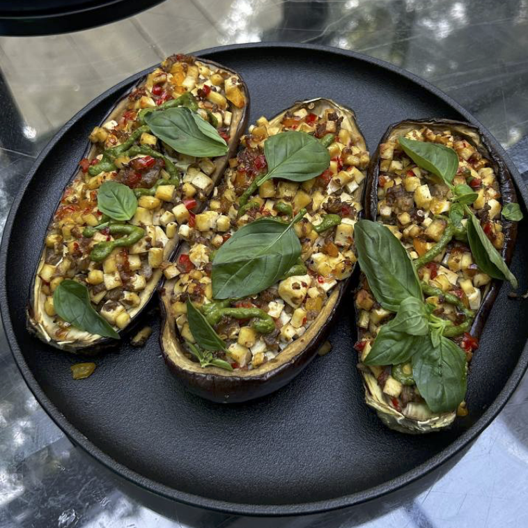 Запеченные баклажаны с болгарским перцем, вялеными томатами, кунжутным маслом и соусом сладкий Чили