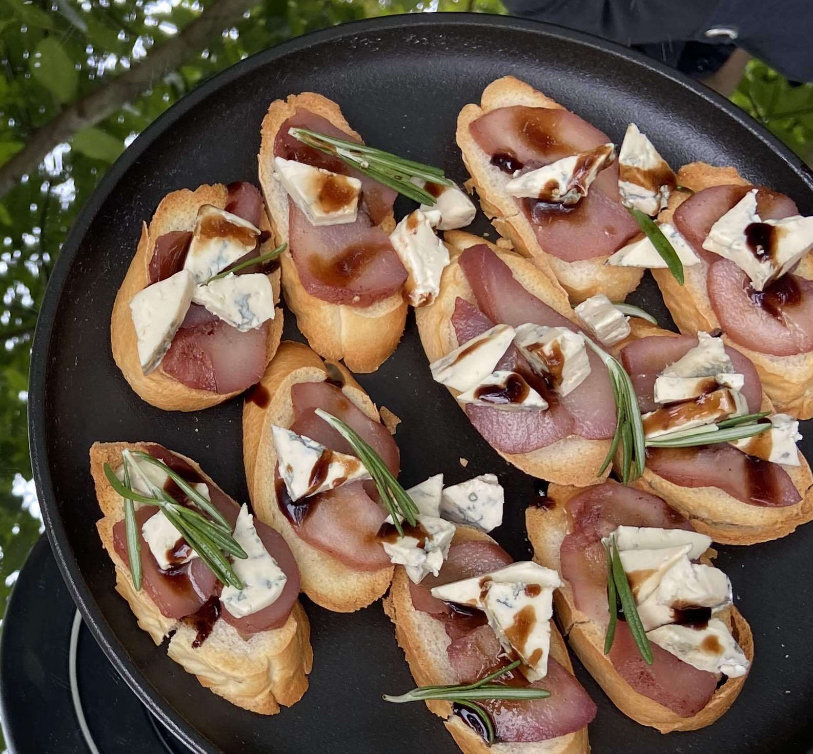 Сыр дор-блю с карамелизированной пряной грушей и кремом из белого бальзамика
