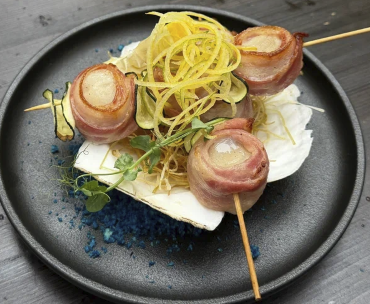 Воздушный шарик из теста с муссом из сибаса, креветкой и свежим шпинатом