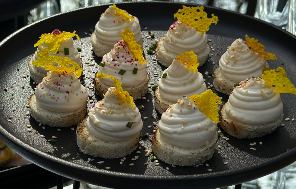 Профитроли с муссом из сибаса, креветкой и свежим шпинатом